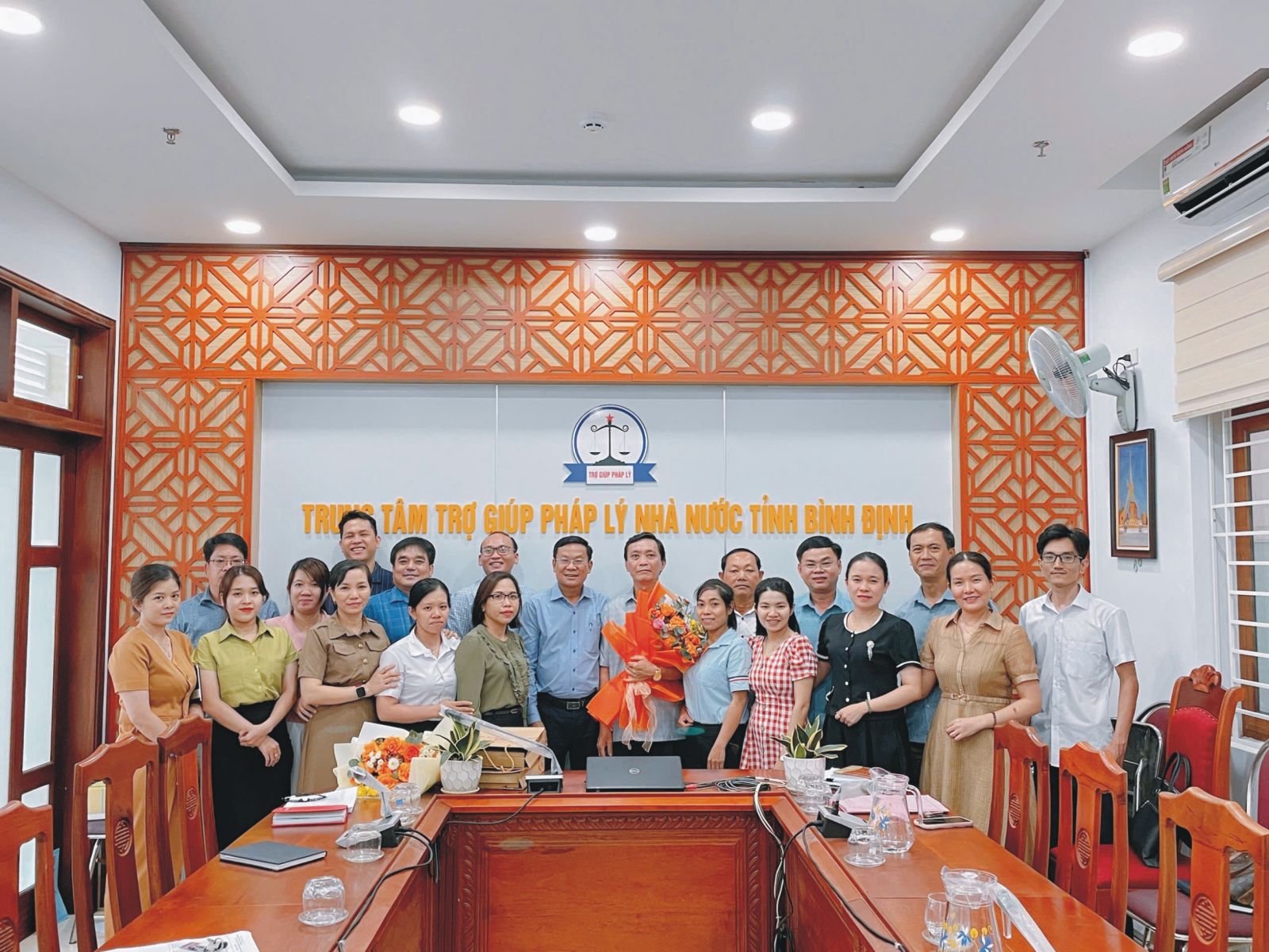 Đồng chí Vinh chụp ảnh kỷ niệm với Lãnh đạo Sở Tư pháp và tập thể Trung tâm TGPLNN tỉnh