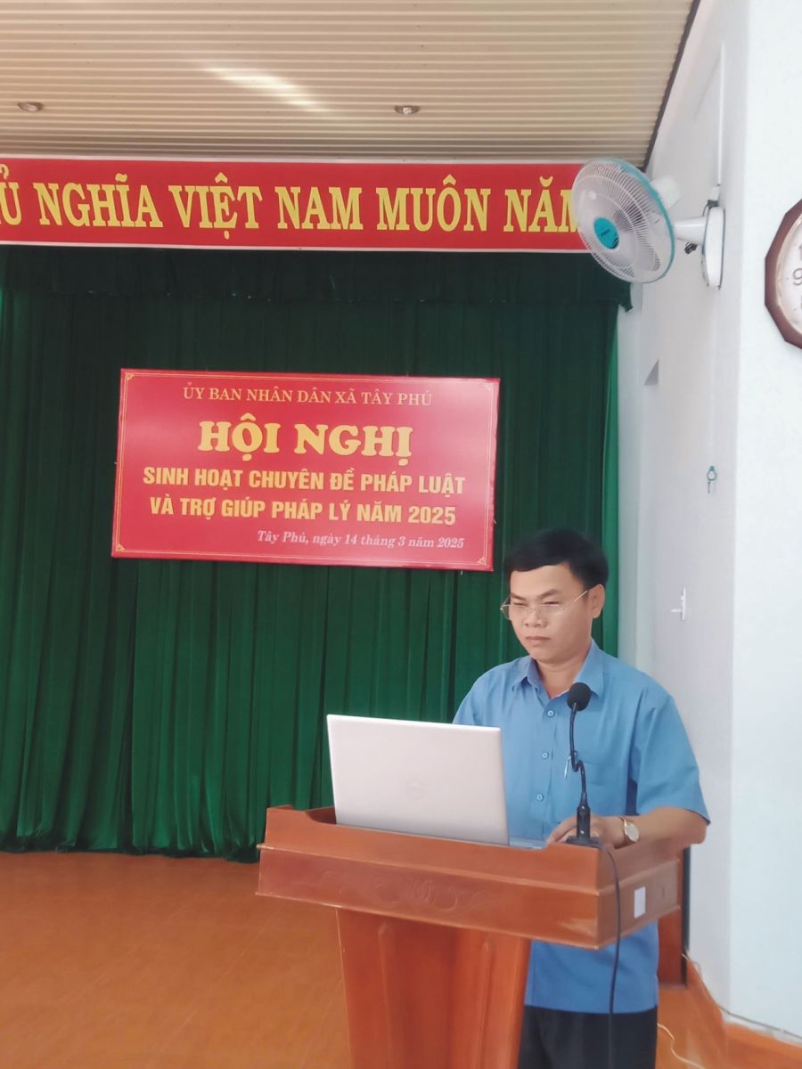 Thực hiện Kế hoạch số 18/KH-TGPL ngày 10/12/2024 của Trung tâm Trợ giúp pháp lý (TGPL) Nhà nước tỉnh Bình Định về Kế hoạch công tác trợ giúp pháp lý năm 2025. Ngày 14 tháng 3 năm 2025, Trung tâm TGPL Nhà nước tỉnh Bình Định, Chi nhánh TGPL số 5 phối hợp với Uỷ ban nhân dân xã Tây Phú, huyện Tây Sơn tổ chức đợt trợ giúp pháp lý ngoài trụ sở kết hợp với sinh hoạt chuyên đề pháp luật cho toàn thể nhân dân trên địa bàn xã.